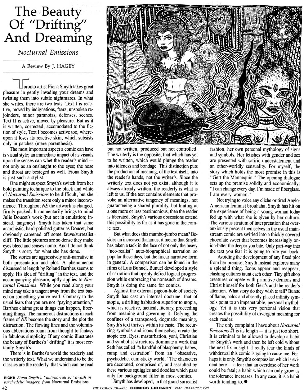 For those new to Smyth, it may take a few dozen pages to get with the flow of her absolutely singular vision, but once they do, I predict they’ll have a hard time putting the book down. Her thick line is extremely clean and intense, and the same is true of the visions she transcribes onto paper — the “intense” part, at any rate.