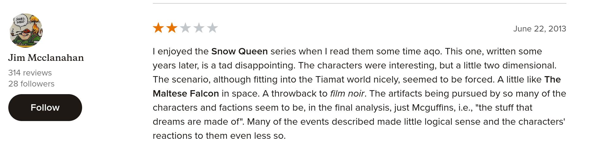 It’s the least liked book in the Snow Queen series on Goodreads.