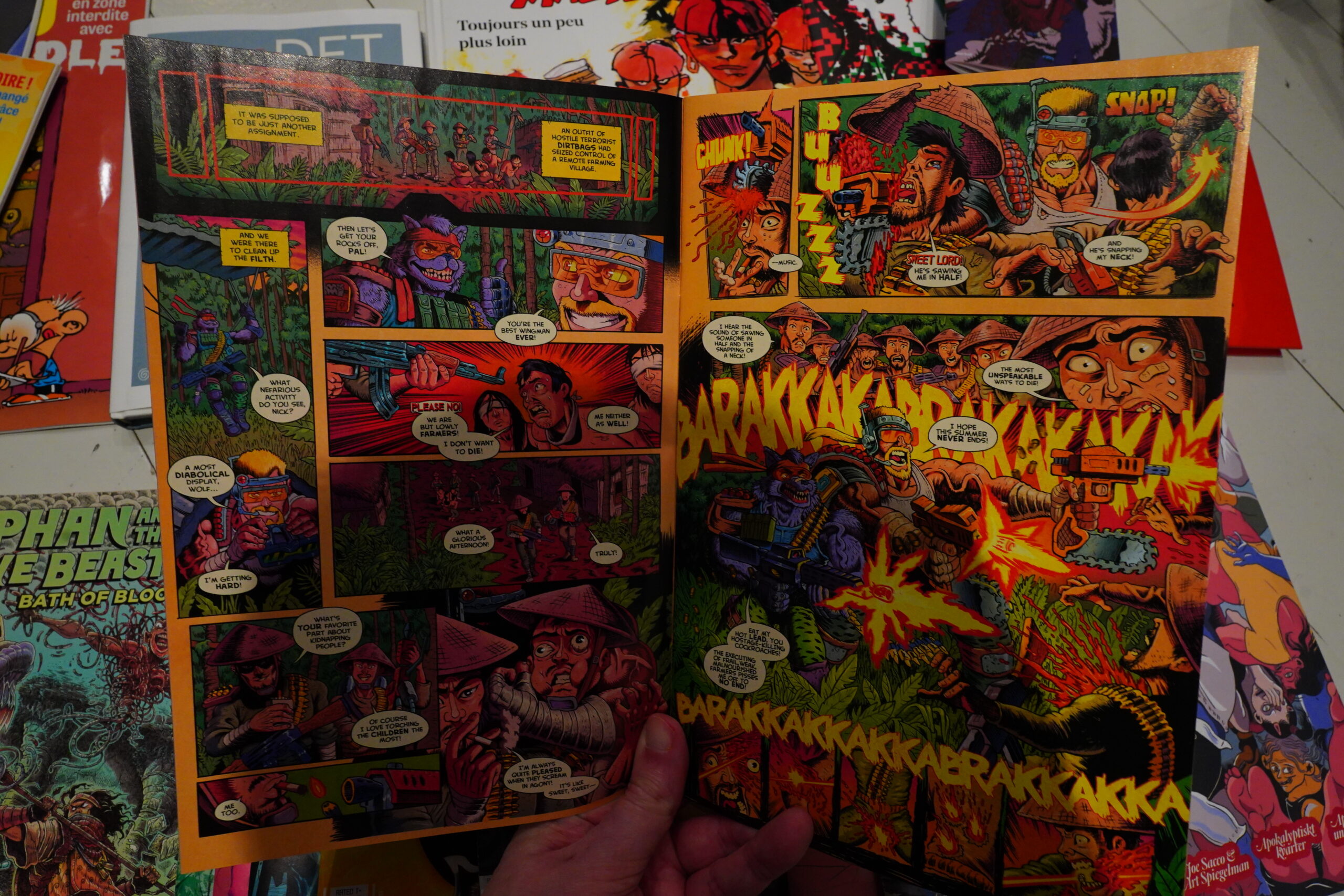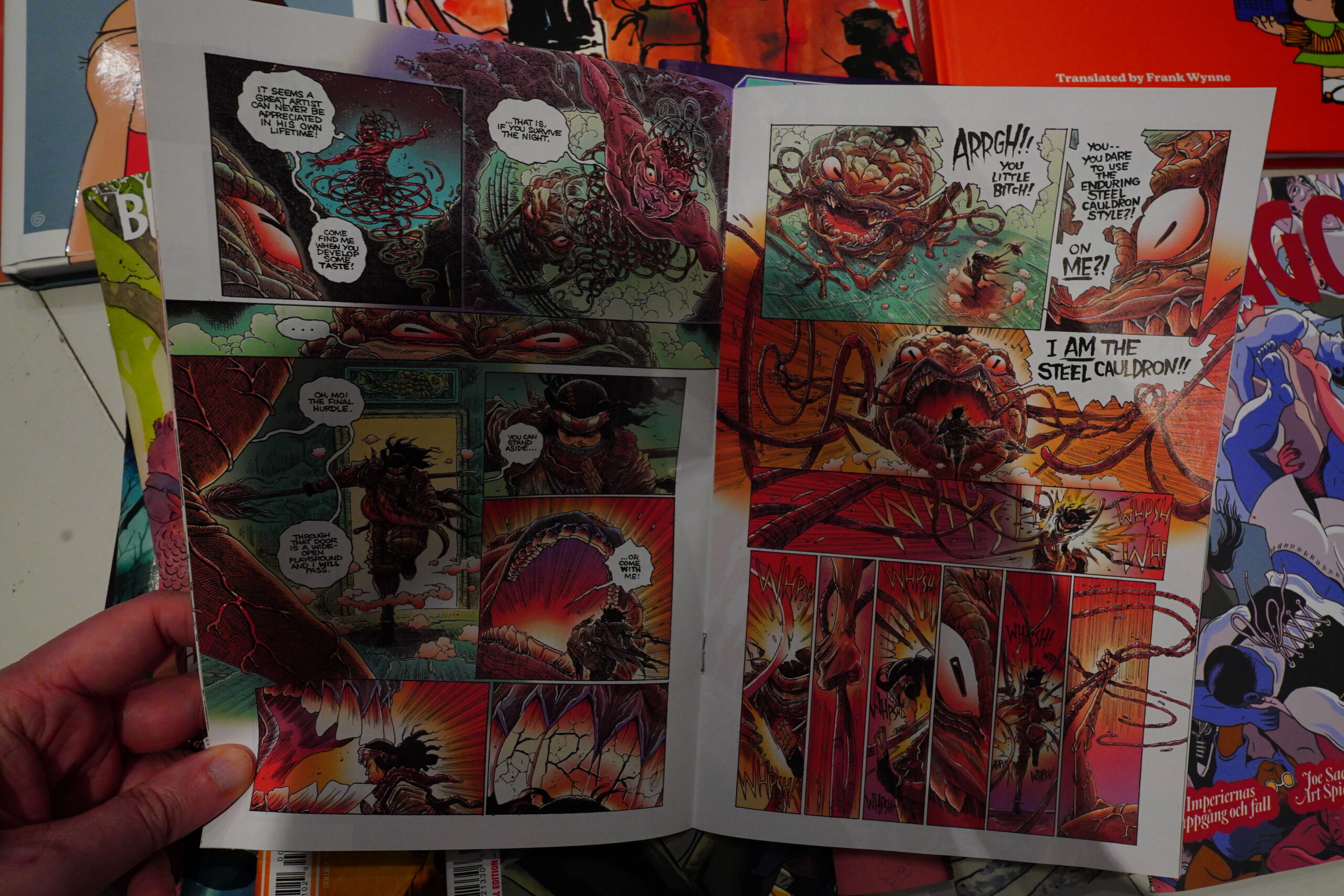 I’m not sure the colour palette chosen for this is totally successful — there’s a whole lot of beige and tans and not much else. I mean, I’ve got these comics in black and white, too, so that’s why I bought these French editions in colour.