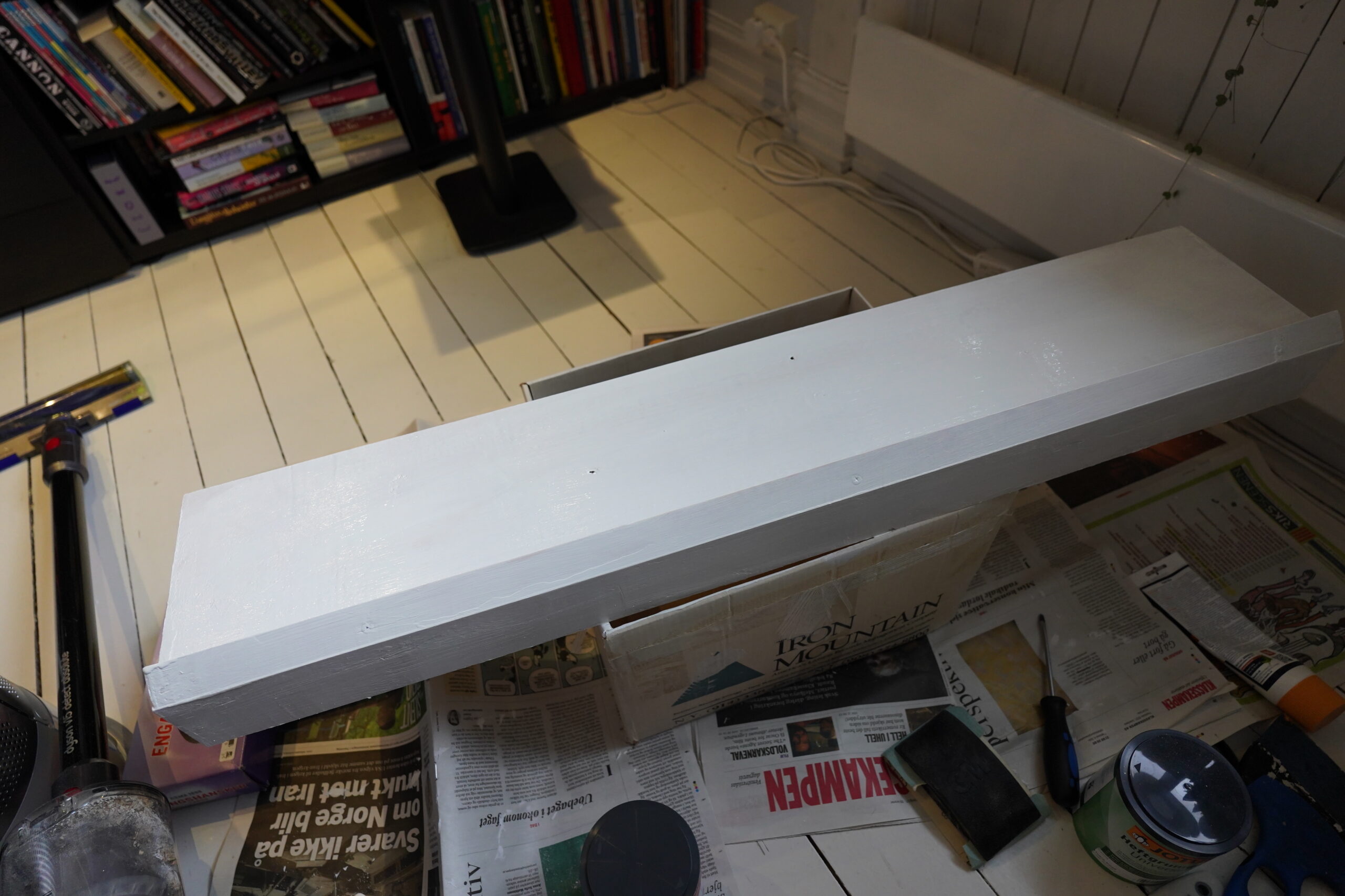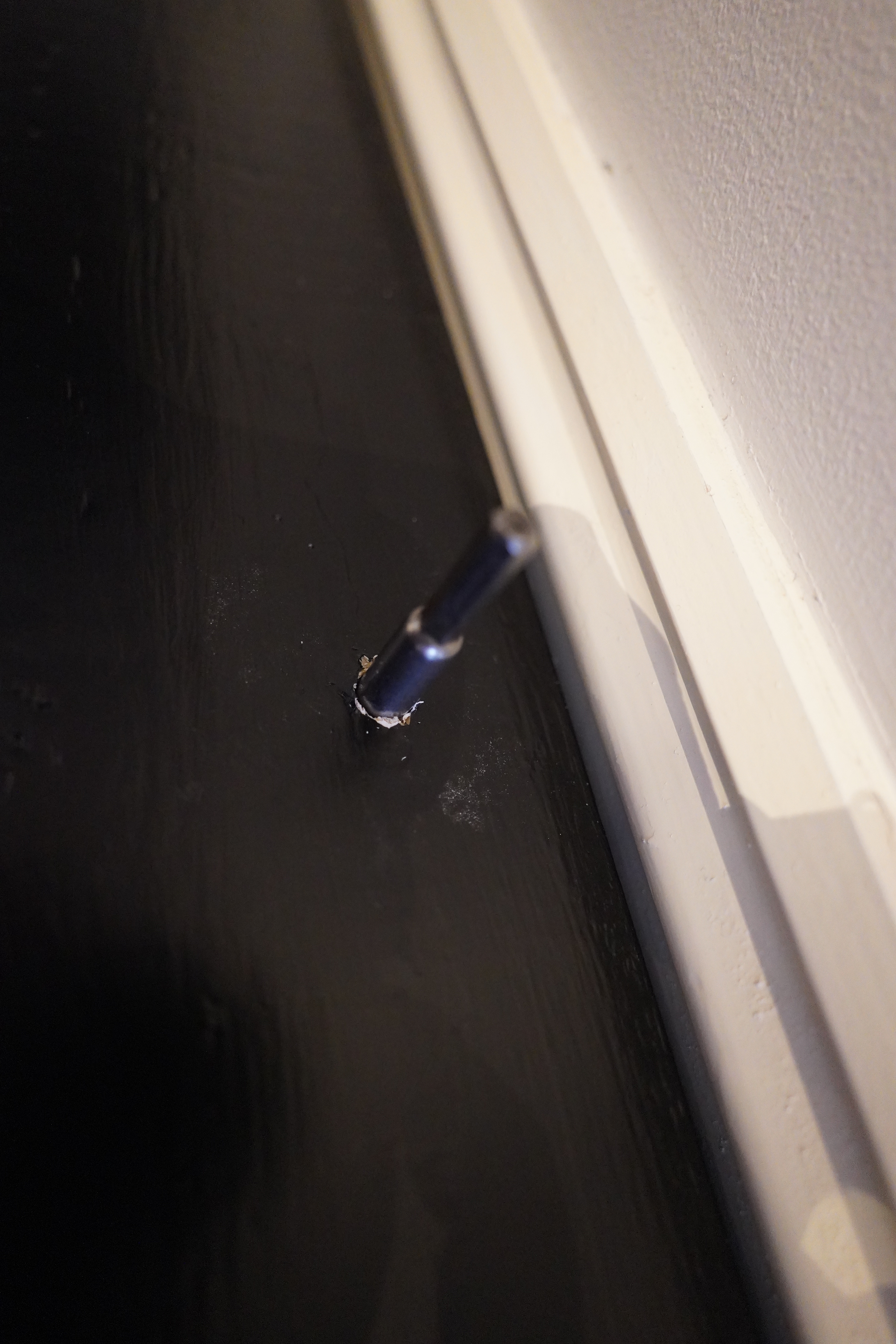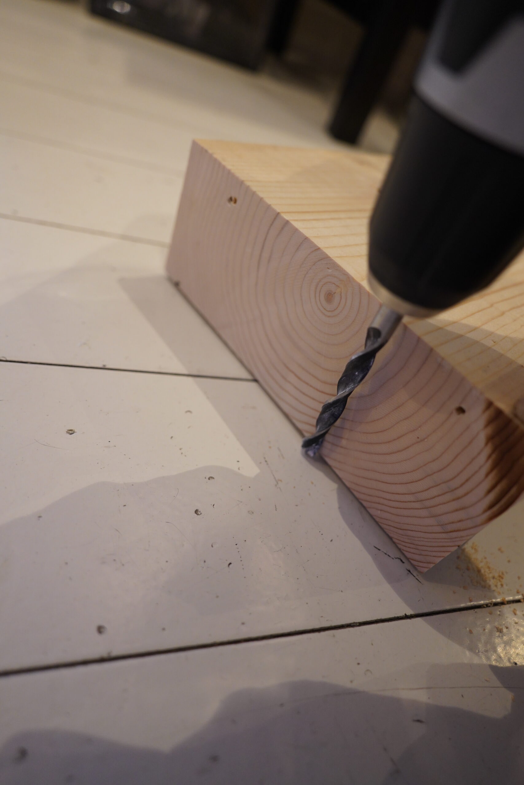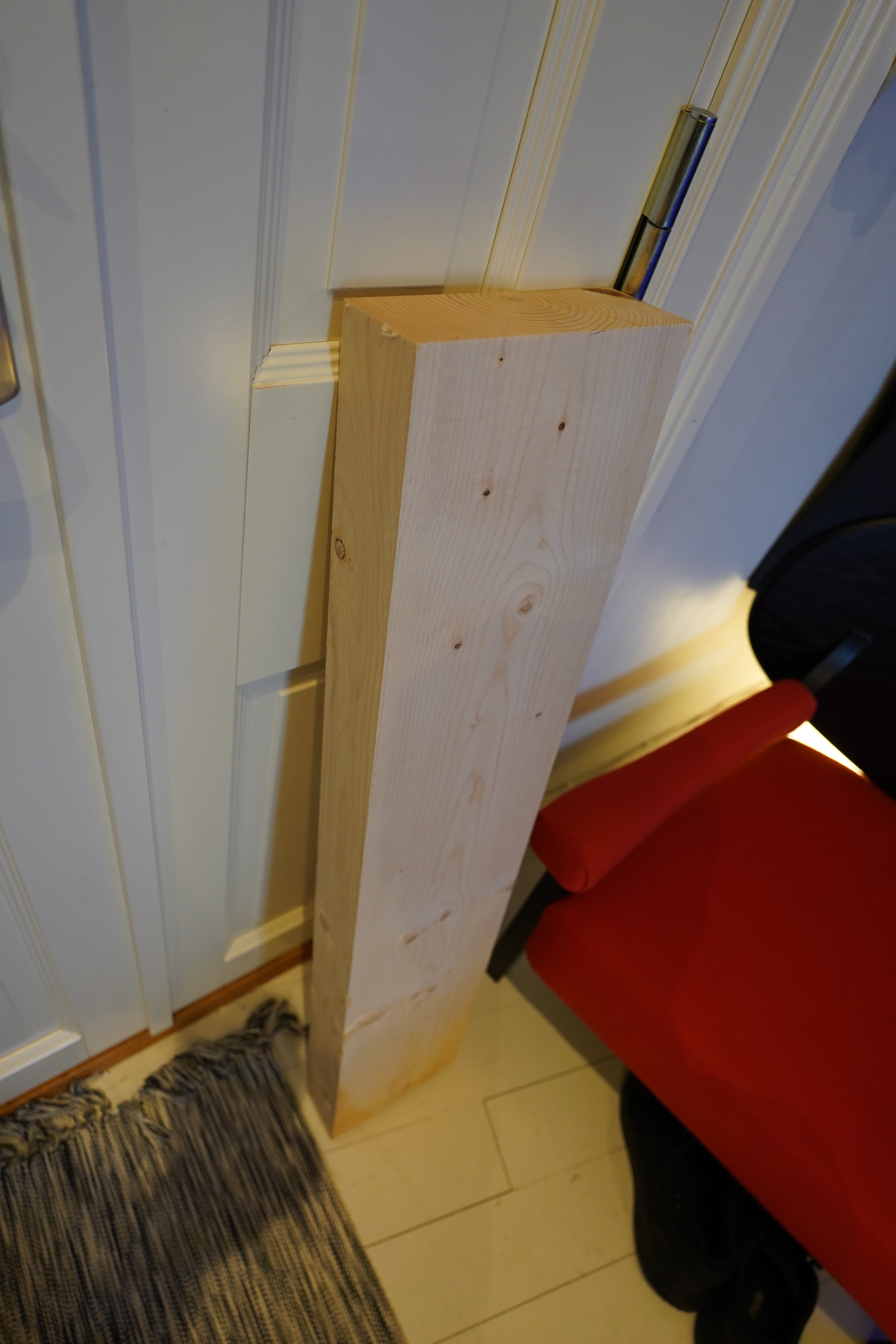 And to fasten it to the floor (it’s a wooden floor (from the 90s), but painted, so it’s not sacrilege to screw something into it), I can drill 80% into the plinthy plank, and the screw it the rest of the way.