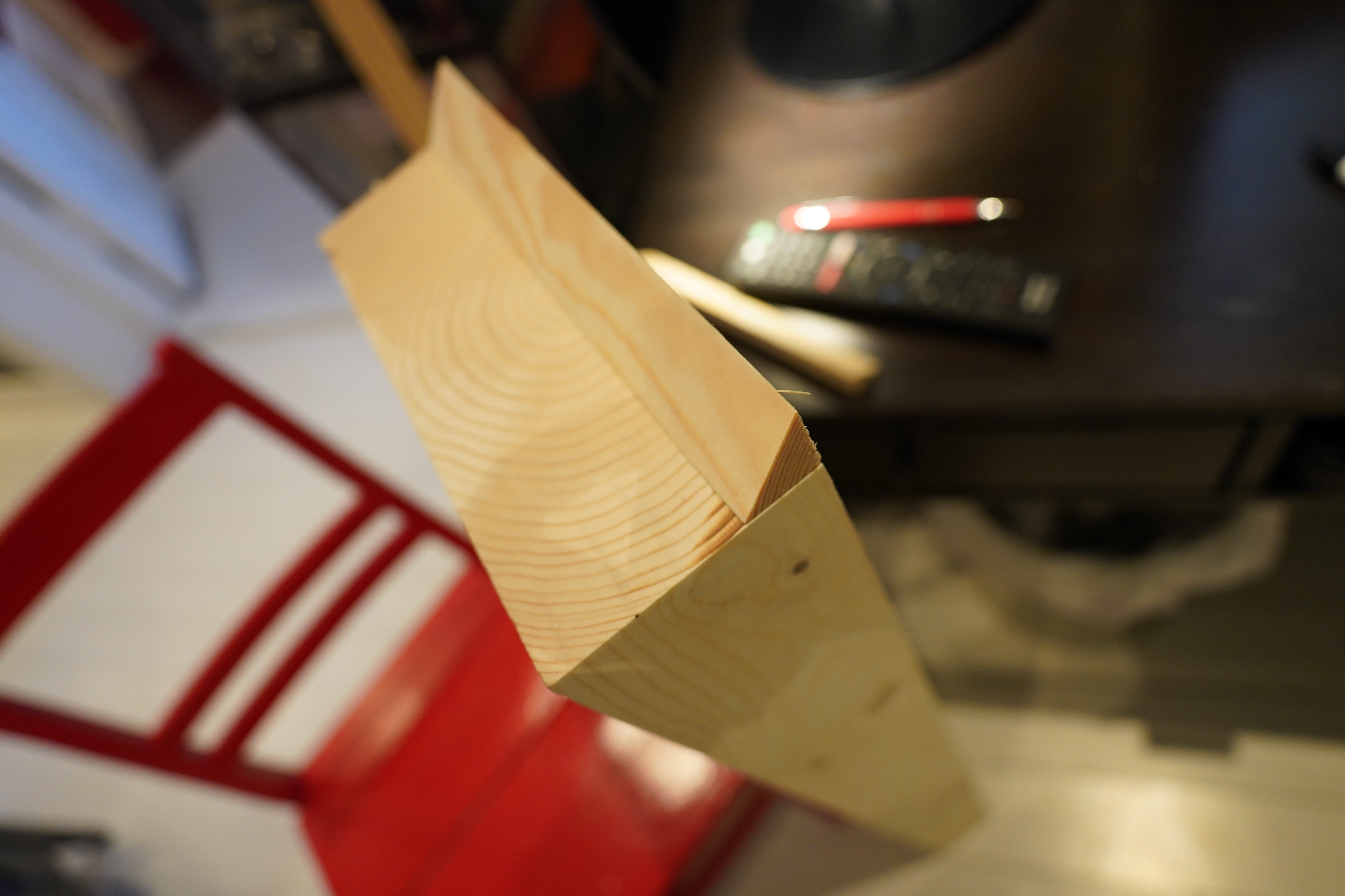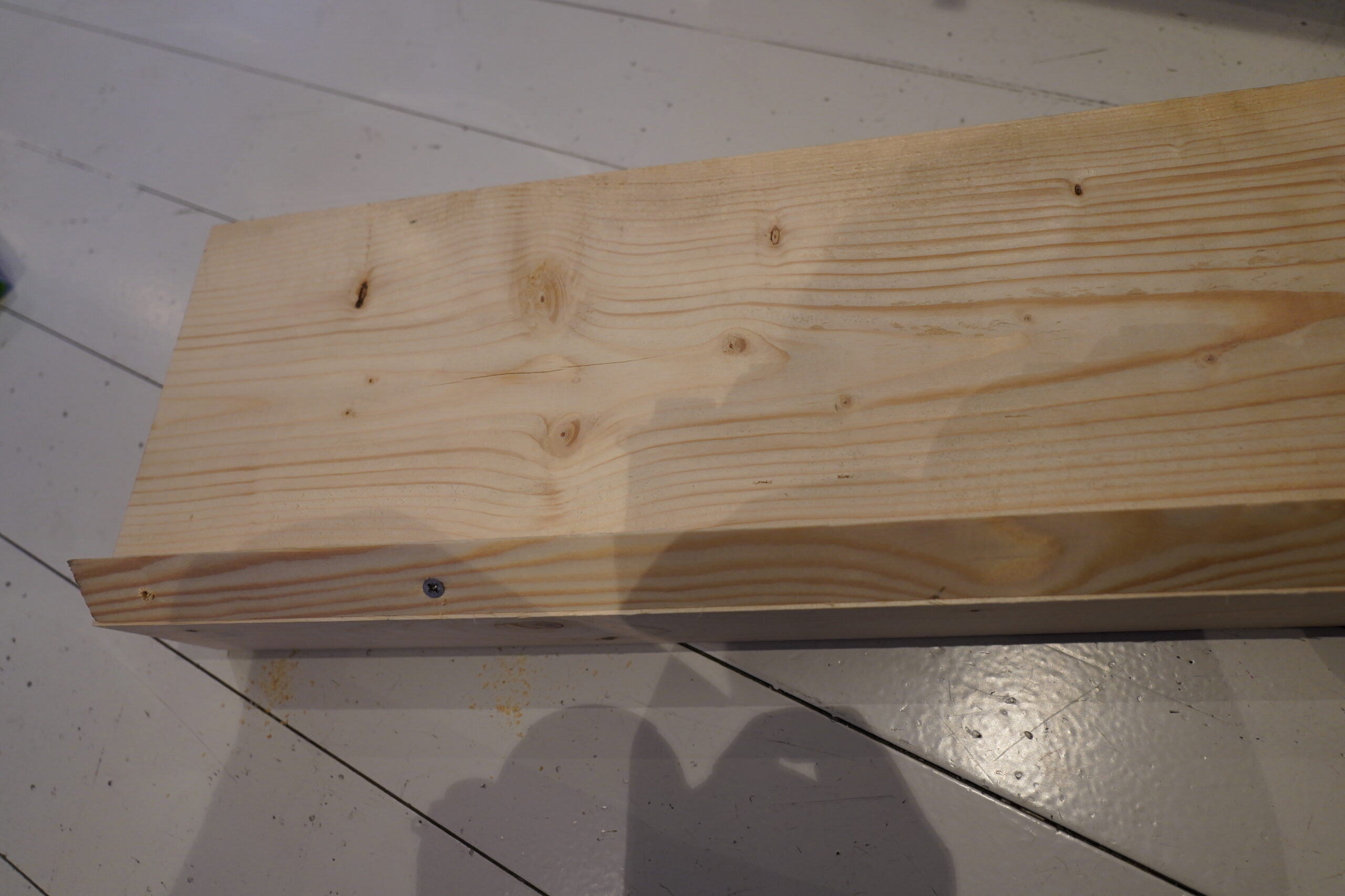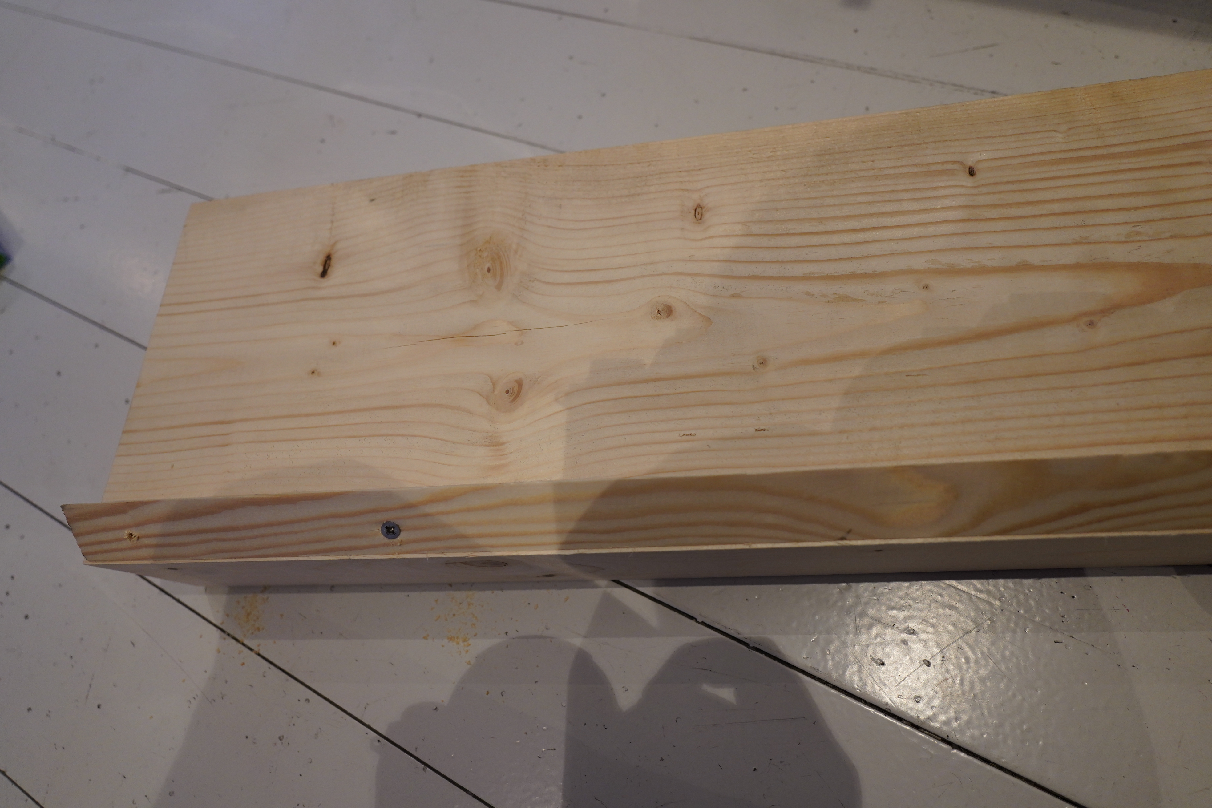 Here’s some wood. It’s 48x148mm big. 148mm is good for the depth — the TV needs to lean towards the wall, and 15cm is the right depth at the bottom. And I could mill a trough near the outer edge that the TV could rest in, so that it doesn’t slip? And I could take two of these and join them together, and then paint them nicely?
