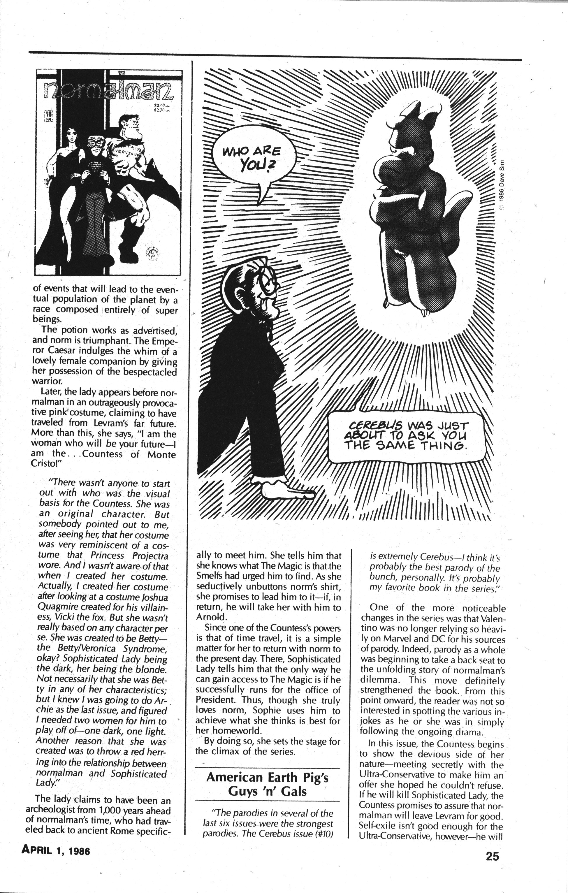 Finally! An issue that doesn’t seem like it’s tossed off while Valentino was thinking about something else. It’s still not actually funny, but Valentino references Cerebus extensively in the layouts…