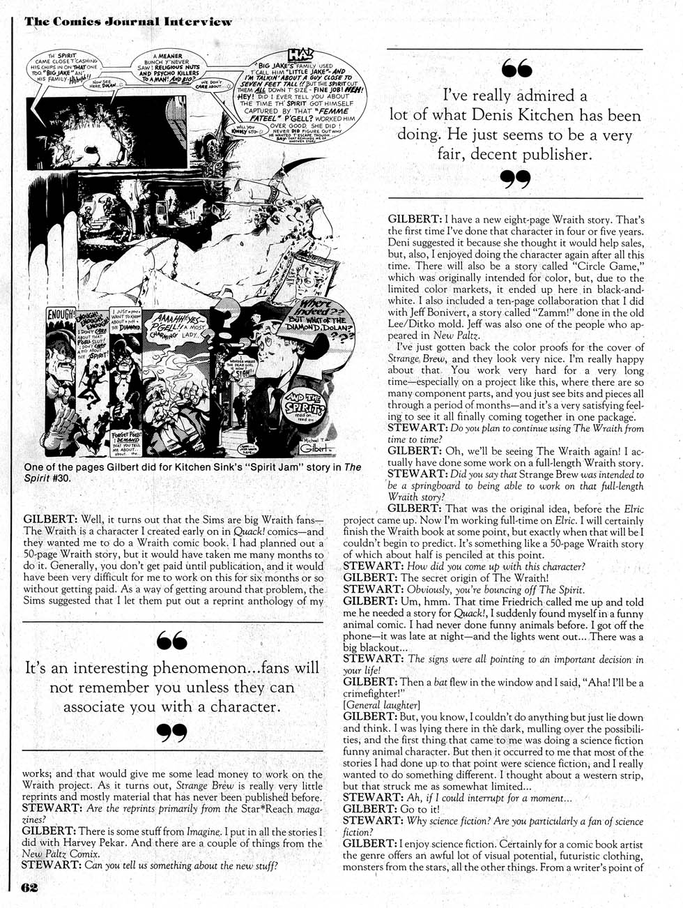 Michael T. Gilbert’s Strange Brew (Aardvark-Vanaheim) Better he should have called it Mixed Bag. From the beginning Gilbert has been a kind of standing threat, always giving the impression that, giyen a regular forum and time to develop, he was ready to become a major figure. Well, here it is ten years, and one has to start wondering whether the threat is just a tease. Not that Strange Brew is necessarily the work of a talent dying on the vine; the flashes of brilliance are as present in the late material as the early, but on the same token, you can read the entire ten-year retrospective and still not have any idea of what Gilbert thinks about any given issue. The Brew is thin gruel: a couple of clever three-page vignettes padded out to eight and ten pages; three Harvey pe slices of life which are, as usual, more bre than meat; a fumetti; three atmosphere pieces. That leaves his Eisner hommage, the Wraith. It’s still his best work, it’s still charming, but it’s still derivative of another man’s work (similar criticisms have been raised about ,Ankfray Illermay). And yet, you can’t count him out; the talent is still there, and he really hasn’t had the regular forum he needs. Perhaps his involvement with Pacific Comics and p. Craig Russell will lead to something. Perhaps it better. The time has long been right, and is begin- ning to rot.